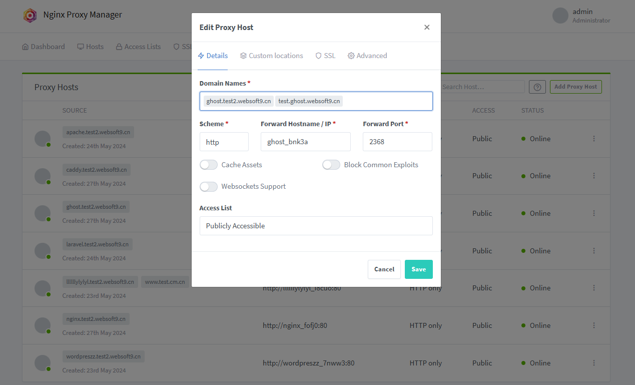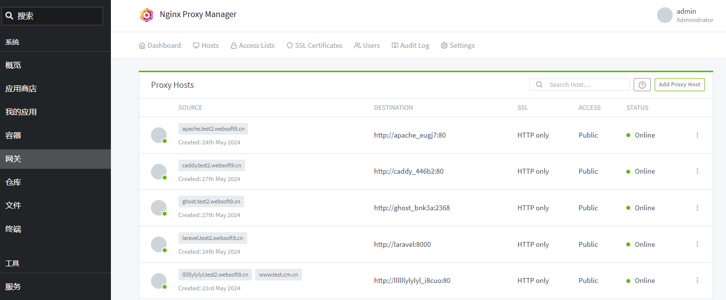 进入 Websoft9 控制台 网关 模块,依次打开菜单: > Hosts > Proxy Hosts