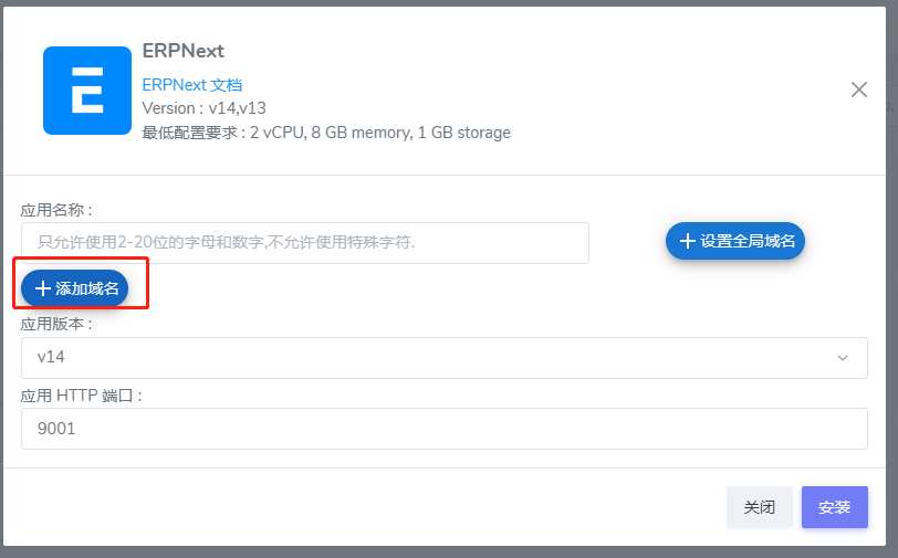 进入应用的 安装 界面后,点击 +添加域名 按钮 ,填写解析的子域名,例如: