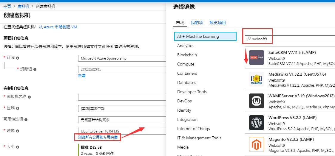 • Portal > 创建虚拟机 > 浏览所有镜像,检索关键词 Websoft9 Application Hosting Platform,找到镜像后开始部署